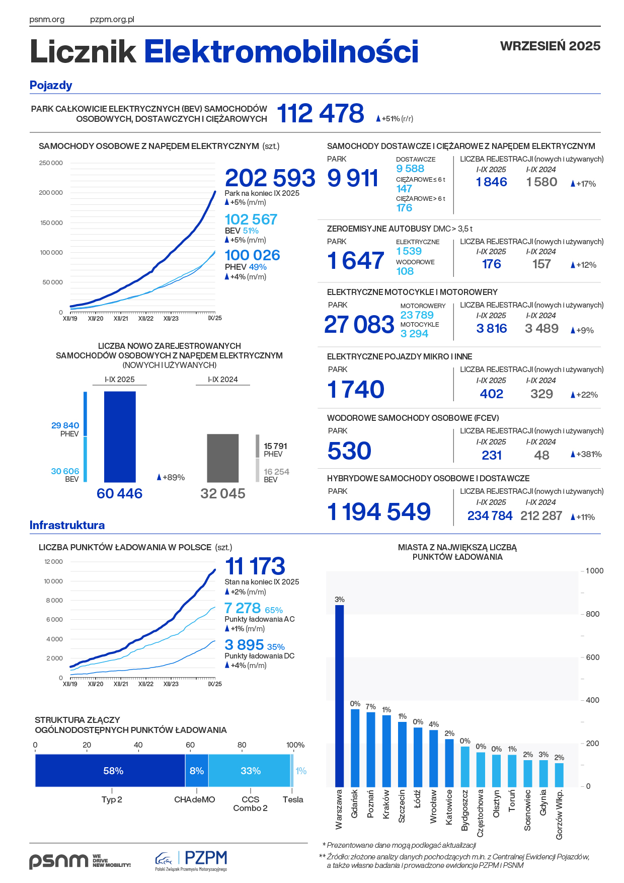 Pod koniec października 2025 r. po polskich drogach jeździło 212 689 samochodów osobowych z napędem elektrycznym. Flota w pełni elektrycznych, osobowych aut (BEV, ang. battery electric vehicles) liczyła 107 931 szt., a park hybryd typu plug-in (PHEV, ang. plug-in hybrid electric vehicles) – 104 758 szt. Liczba samochodów dostawczych i ciężarowych z napędem elektrycznym wynosiła 10 613 szt. Stale rośnie flota elektrycznych motorowerów i motocykli, która na koniec października składała się z 27 507 szt., jak również liczba osobowych i dostawczych aut hybrydowych, która powiększyła się do 1 221 096 szt. Pod koniec ubiegłego miesiąca park autobusów zeroemisyjnych w Polsce wzrósł do 1 691 szt. (z czego pojazdy całkowicie elektryczne stanowiły 1569 szt., zaś wodorowe – 122 szt.).