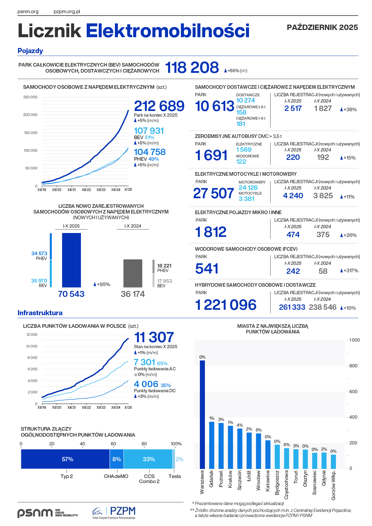 Pod koniec października 2025 r. po polskich drogach jeździło 212 689 samochodów osobowych z napędem elektrycznym. Flota w pełni elektrycznych, osobowych aut (BEV, ang. battery electric vehicles) liczyła 107 931 szt., a park hybryd typu plug-in (PHEV, ang. plug-in hybrid electric vehicles) – 104 758 szt. Liczba samochodów dostawczych i ciężarowych z napędem elektrycznym wynosiła 10 613 szt. Stale rośnie flota elektrycznych motorowerów i motocykli, która na koniec października składała się z 27 507 szt., jak również liczba osobowych i dostawczych aut hybrydowych, która powiększyła się do 1 221 096 szt. Pod koniec ubiegłego miesiąca park autobusów zeroemisyjnych w Polsce wzrósł do 1 691 szt. (z czego pojazdy całkowicie elektryczne stanowiły 1569 szt., zaś wodorowe – 122 szt.).
