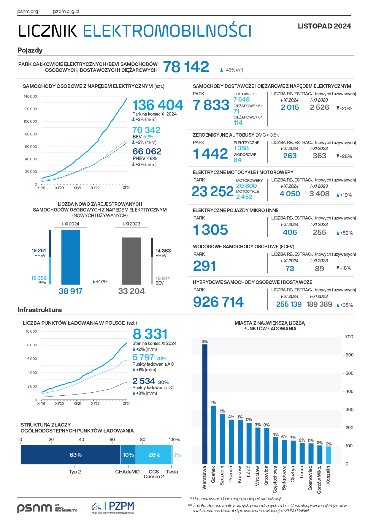 Pod koniec listopada 2024 r. po polskich drogach jeździły 136 404 samochody osobowe z napędem elektrycznym. Flota w pełni elektrycznych, osobowych aut (BEV, ang. battery electric vehicles) liczyła 70 342 szt., a park hybryd typu plug-in (PHEV, ang. plug-in hybrid electric vehicles) – 66 062 szt. Liczba samochodów dostawczych i ciężarowych z napędem elektrycznym wynosiła 7 833 szt. Stale rośnie też flota elektrycznych motorowerów i motocykli, która na koniec listopada składała się z 23 252 szt., jak również liczba osobowych i dostawczych aut hybrydowych, która powiększyła się do 926 714 szt. Pod koniec ubiegłego miesiąca park autobusów zeroemisyjnych w Polsce wzrósł do 1 442 szt. (z czego pojazdy całkowicie elektryczne stanowiły 1358 szt., zaś wodorowe – 84 szt.).