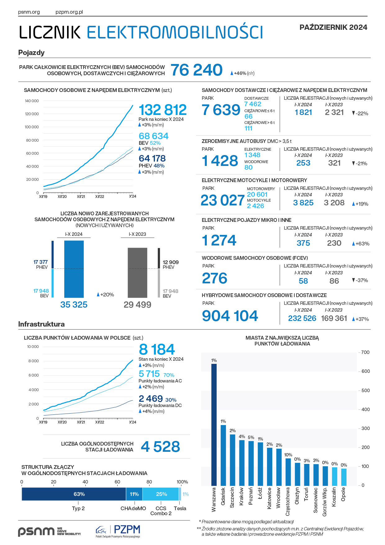 Według danych z końca października 2024 r., w Polsce było zarejestrowane łącznie 76 240 osobowych i użytkowych samochodów całkowicie elektrycznych (BEV). Przez dziesięć miesięcy br. ich liczba zwiększyła się o 19 763 szt. (tj. o 5% więcej niż w analogicznym okresie 2023 r.) – wynika z Licznika Elektromobilności, uruchomionego przez PZPM i PSNM.